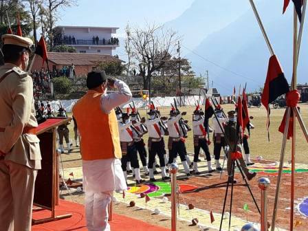 गोपेश्वर। पूरे देश और प्रदेश में गणतंत्र हर्षोल्लास से मनाया गया। इस दौरान प्रदेश के जिला मुख्यालयों और शैक्षणिक संस्थाओं में में घ्वाजारोण किया गया। विभिन्न जगहों में परेड और सांस्कृतिक कार्यक्रमों का आयोजन किया। इसी क्रम में प्रदेश के सहकारिता एवं उच्च शिक्षा मंत्री डा० धन सिंह रावत ने चमोली में ध्वाजरोहण किया। इस दौरान उन्होंने जिले की मुख्य परेड का निरीक्षण भी किया।